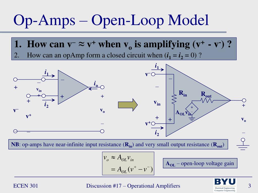 + – Op-Amps – Open-Loop Model • How can v– ≈ v+ when vo is amplifying (v+ - v-) ? • How can an opAmp form a closed circuit when (i1 = i2 = 0) ? i1 v– – – vin + Ideally i1 = i2 = 0 (since Rin → ∞) Rin Rout + vo – AOLvin + v+ i2 What happens as AOL → ∞ ? → v– ≈ v+ Discussion #17 – Operational Amplifiers