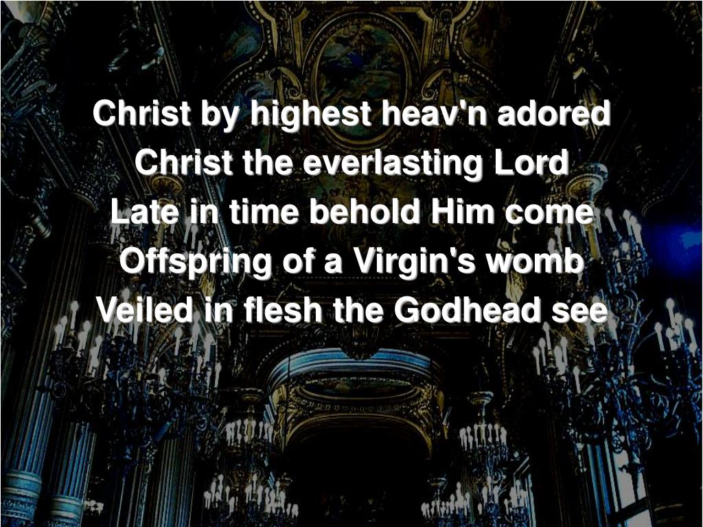 Christ by highest heav'n adored Christ the everlasting Lord Late in time behold Him come Offspring of a Virgin's womb Veiled in flesh the Godhead see