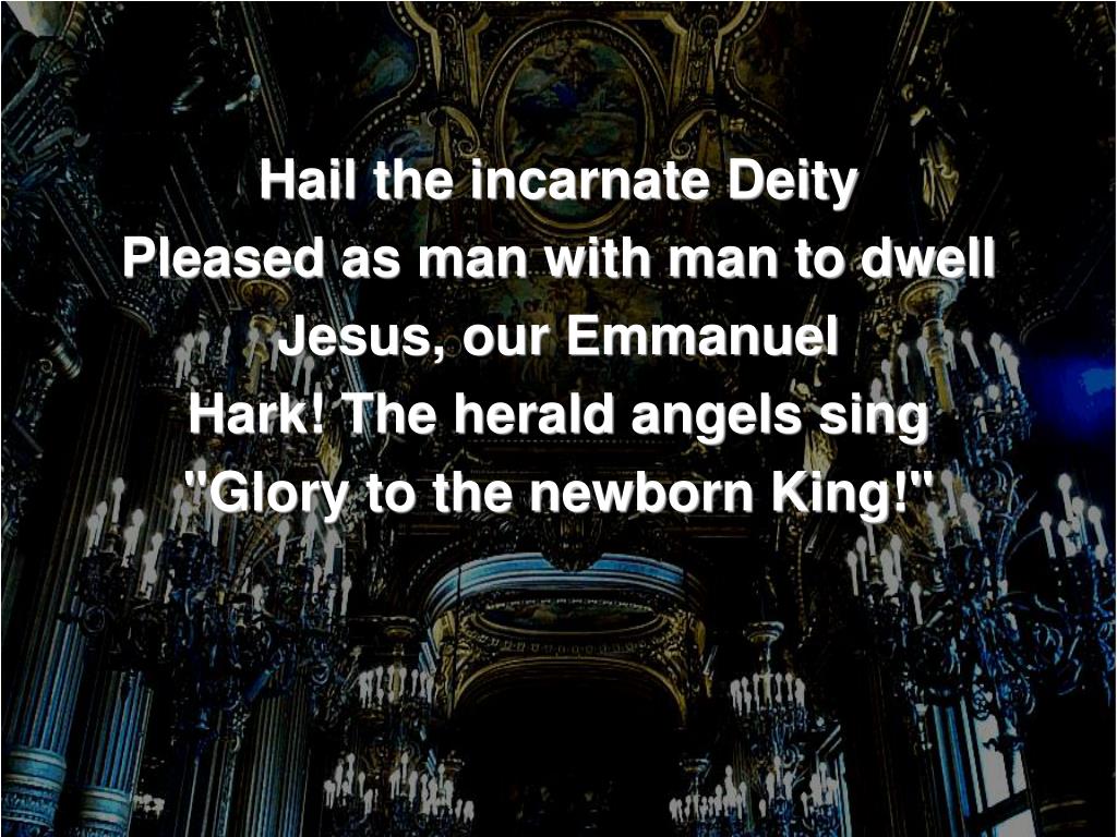 Hail the incarnate Deity Pleased as man with man to dwell Jesus, our Emmanuel Hark! The herald angels sing "Glory to the newborn King!"