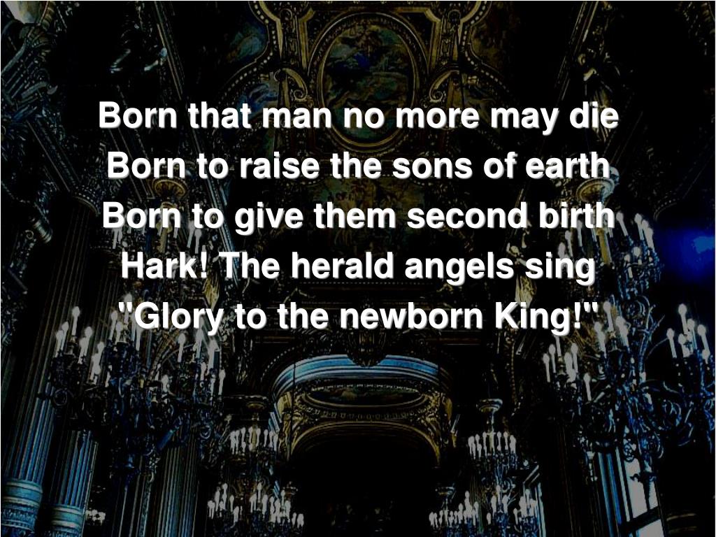 Born that man no more may die Born to raise the sons of earth Born to give them second birth Hark! The herald angels sing "Glory to the newborn King!"