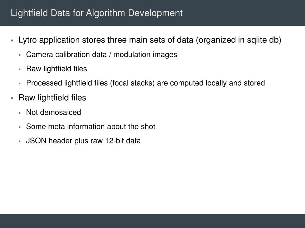 Lightfield Data for Algorithm Development • Lytro application stores three main sets of data (organized in sqlitedb) • Camera calibration data / modulation images • Raw lightfield files • Processed lightfield files (focal stacks) are computed locally and stored • Raw lightfield files • Not demosaiced • Some meta information about the shot • JSON header plus raw 12-bit data