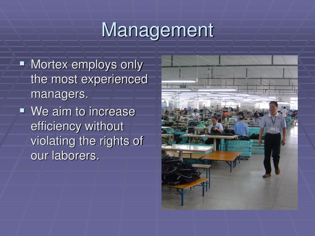 Mortex employs only the most experienced managers. We aim to increase efficiency without violating the rights of our laborers. Management