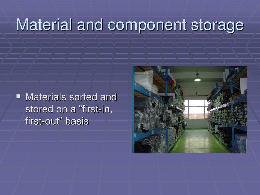 Materials sorted and stored on a “first-in, first-out” basis Material and component storage