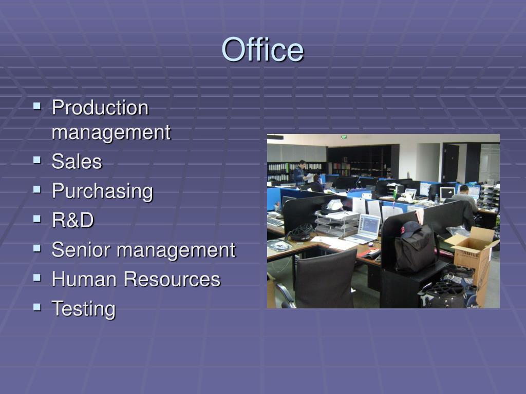 Production management Sales Purchasing R&D Senior management Human Resources Testing Office