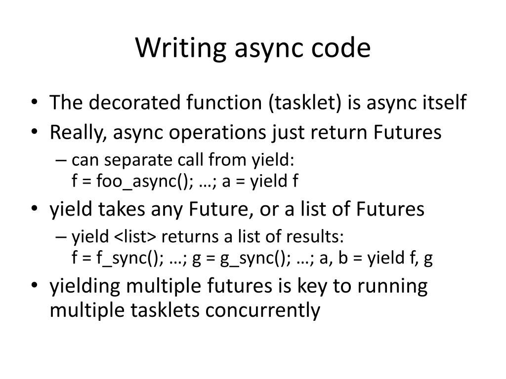 Writing async code • The decorated function (tasklet) is async itself • Really, async operations just return Futures • can separate call from yield:f = foo_async(); …; a = yield f • yield takes any Future, or a list of Futures • yield <list> returns a list of results:f = f_sync(); …; g = g_sync(); …; a, b = yield f, g • yielding multiple futures is key to running multiple tasklets concurrently