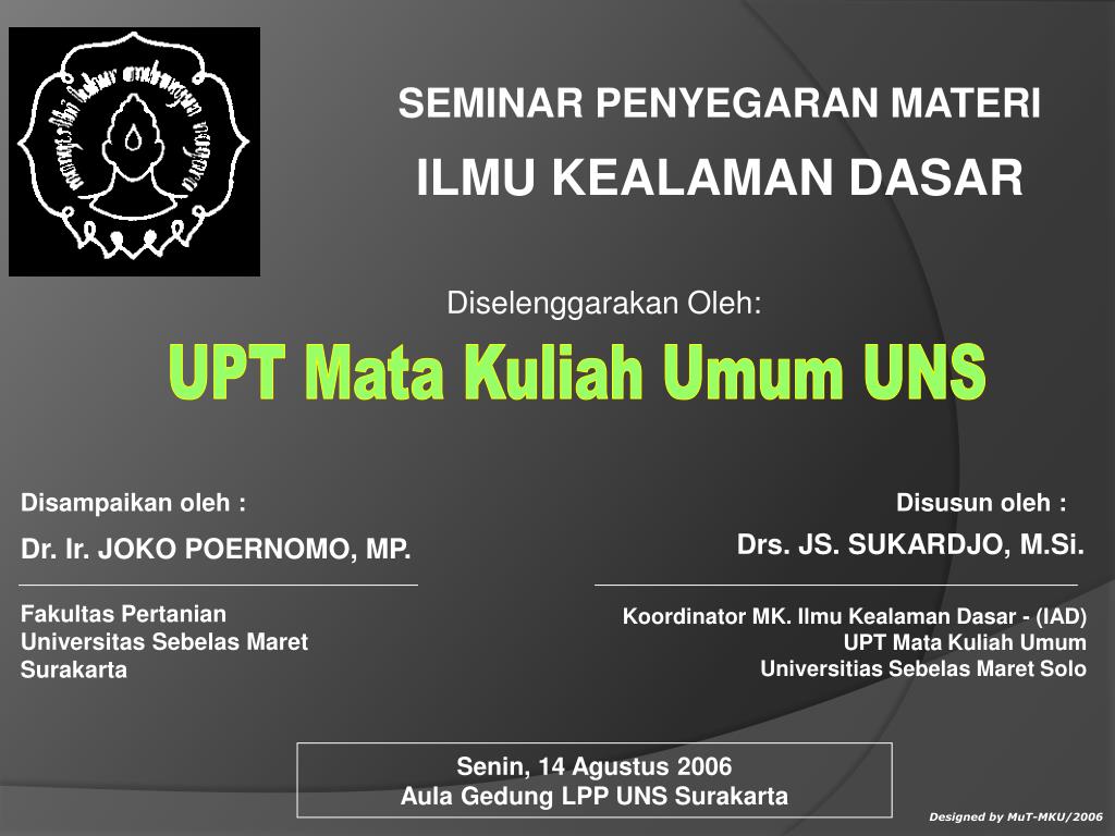 SEMINAR PENYEGARAN MATERI ILMU KEALAMAN DASAR Diselenggarakan Oleh: UPT Mata Kuliah Umum UNS Disampaikan oleh : Disusun oleh : Dr. Ir. JOKO POERNOMO, MP. Drs. JS. SUKARDJO, M.Si. Fakultas PertanianUniversitas Sebelas MaretSurakarta Koordinator MK. Ilmu Kealaman Dasar - (IAD)UPT Mata Kuliah Umum Universitias Sebelas Maret Solo Senin, 14 Agustus 2006Aula Gedung LPP UNS Surakarta Designed by MuT-MKU/2006