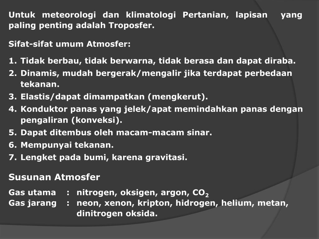 Untuk meteorologi dan klimatologi Pertanian, lapisan yang paling penting adalah Troposfer. Sifat-sifat umum Atmosfer: • Tidak berbau, tidak berwarna, tidak berasa dan dapat diraba. • Dinamis, mudah bergerak/mengalir jika terdapat perbedaan tekanan. • Elastis/dapat dimampatkan (mengkerut). • Konduktor panas yang jelek/apat memindahkan panas dengan pengaliran (konveksi). • Dapat ditembus oleh macam-macam sinar. • Mempunyai tekanan. • Lengket pada bumi, karena gravitasi. Susunan Atmosfer Gas utama : nitrogen, oksigen, argon, CO2 Gas jarang : neon, xenon, kripton, hidrogen, helium, metan, dinitrogen oksida.
