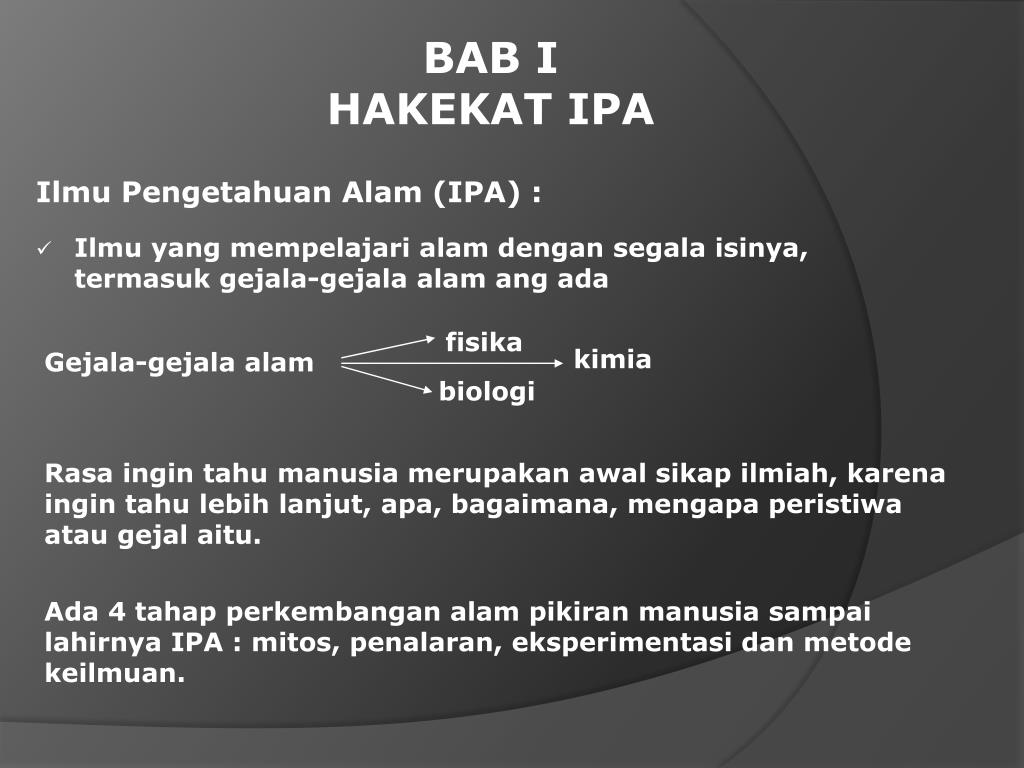 Ilmu Pengetahuan Alam (IPA) : • Ilmu yang mempelajari alam dengan segala isinya, termasuk gejala-gejala alam ang ada fisika kimia Gejala-gejala alam biologi Rasa ingin tahu manusia merupakan awal sikap ilmiah, karena ingin tahu lebih lanjut, apa, bagaimana, mengapa peristiwa atau gejal aitu. Ada 4 tahap perkembangan alam pikiran manusia sampai lahirnya IPA : mitos, penalaran, eksperimentasi dan metode keilmuan. BAB I HAKEKAT IPA