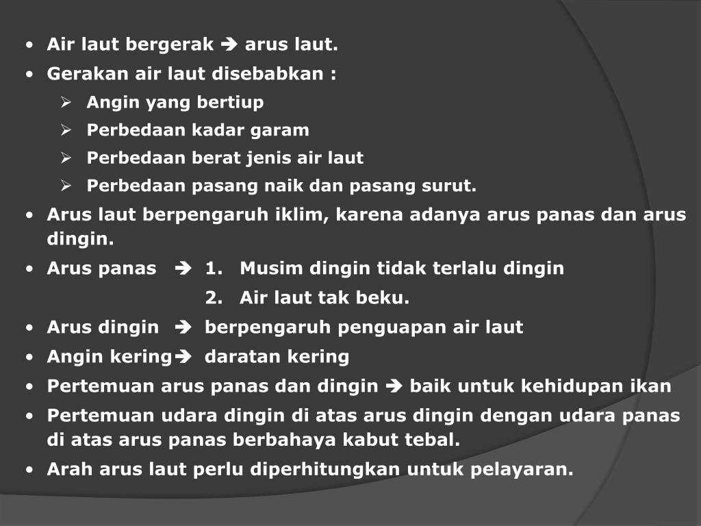 Air laut bergerak arus laut. • Gerakan air laut disebabkan : • Angin yang bertiup • Perbedaan kadar garam • Perbedaan berat jenis air laut • Perbedaan pasang naik dan pasang surut. • Arus laut berpengaruh iklim, karena adanya arus panas dan arus dingin. • Arus panas 1. Musim dingin tidak terlalu dingin • 2. Air laut tak beku. • Arus dingin berpengaruh penguapan air laut • Angin kering daratan kering • Pertemuan arus panas dan dingin baik untuk kehidupan ikan • Pertemuan udara dingin di atas arus dingin dengan udara panas di atas arus panas berbahaya kabut tebal. • Arah arus laut perlu diperhitungkan untuk pelayaran.