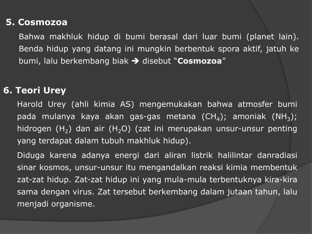 5. Cosmozoa Bahwa makhluk hidup di bumi berasal dari luar bumi (planet lain). Benda hidup yang datang ini mungkin berbentuk spora aktif, jatuh ke bumi, lalu berkembang biak disebut “Cosmozoa” 6. Teori Urey Harold Urey (ahli kimia AS) mengemukakan bahwa atmosfer bumi pada mulanya kaya akan gas-gas metana (CH4); amoniak (NH3); hidrogen (H2) dan air (H2O) (zat ini merupakan unsur-unsur penting yang terdapat dalam tubuh makhluk hidup). Diduga karena adanya energi dari aliran listrik halilintar danradiasi sinar kosmos, unsur-unsur itu mengandalkan reaksi kimia membentuk zat-zat hidup. Zat-zat hidup ini yang mula-mula terbentuknya kira-kira sama dengan virus. Zat tersebut berkembang dalam jutaan tahun, lalu menjadi organisme.