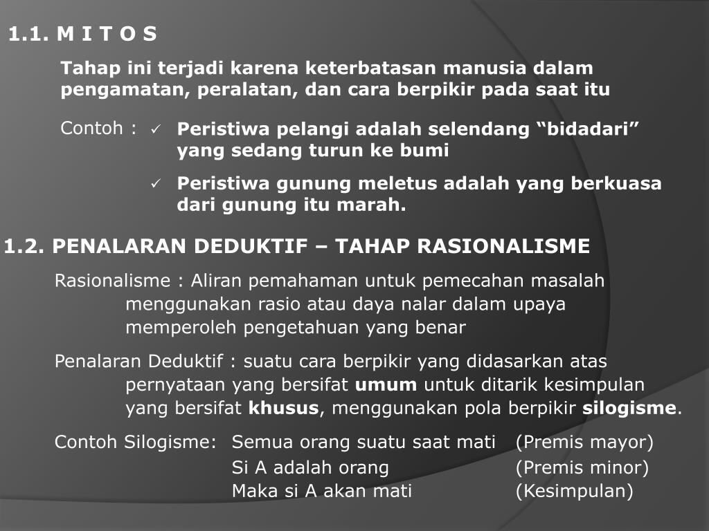 1.1. M I T O S Tahap ini terjadi karena keterbatasan manusia dalam pengamatan, peralatan, dan cara berpikir pada saat itu Contoh : • Peristiwa pelangi adalah selendang “bidadari” yang sedang turun ke bumi • Peristiwa gunung meletus adalah yang berkuasa dari gunung itu marah. 1.2. PENALARAN DEDUKTIF – TAHAP RASIONALISME Rasionalisme : Aliran pemahaman untuk pemecahan masalah menggunakan rasio atau daya nalar dalam upaya memperoleh pengetahuan yang benar Penalaran Deduktif : suatu cara berpikir yang didasarkan atas pernyataan yang bersifat umum untuk ditarik kesimpulan yang bersifat khusus, menggunakan pola berpikir silogisme. Contoh Silogisme: Semua orang suatu saat mati (Premis mayor) Si A adalah orang (Premis minor) Maka si A akan mati (Kesimpulan)