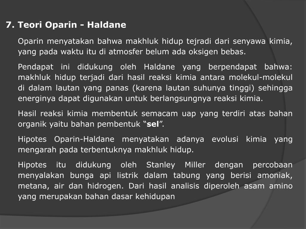 7. Teori Oparin - Haldane Oparin menyatakan bahwa makhluk hidup tejradi dari senyawa kimia, yang pada waktu itu di atmosfer belum ada oksigen bebas. Pendapat ini didukung oleh Haldane yang berpendapat bahwa: makhluk hidup terjadi dari hasil reaksi kimia antara molekul-molekul di dalam lautan yang panas (karena lautan suhunya tinggi) sehingga energinya dapat digunakan untuk berlangsungnya reaksi kimia. Hasil reaksi kimia membentuk semacam uap yang terdiri atas bahan organik yaitu bahan pembentuk “sel”. Hipotes Oparin-Haldane menyatakan adanya evolusi kimia yang mengarah pada terbentuknya makhluk hidup. Hipotes itu didukung oleh Stanley Miller dengan percobaan menyalakan bunga api listrik dalam tabung yang berisi amoniak, metana, air dan hidrogen. Dari hasil analisis diperoleh asam amino yang merupakan bahan dasar kehidupan