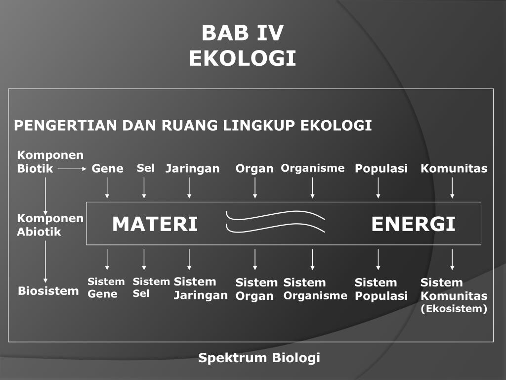 PENGERTIAN DAN RUANG LINGKUP EKOLOGI Komponen Biotik Gene Sel Jaringan Organ Organisme Populasi Komunitas MATERIENERGI Komponen Abiotik Sistem Jaringan Sistem Gene Sistem Sel Sistem Organ Sistem Organisme Sistem Populasi Sistem Komunitas (Ekosistem) Biosistem Spektrum Biologi BAB IV EKOLOGI