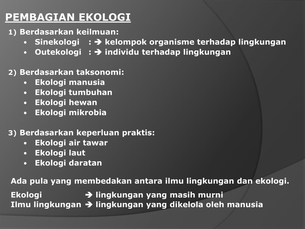 PEMBAGIAN EKOLOGI • Berdasarkan keilmuan: • Sinekologi : kelompok organisme terhadap lingkungan • Outekologi : individu terhadap lingkungan • Berdasarkan taksonomi: • Ekologi manusia • Ekologi tumbuhan • Ekologi hewan • Ekologi mikrobia • Berdasarkan keperluan praktis: • Ekologi air tawar • Ekologi laut • Ekologi daratan Ada pula yang membedakan antara ilmu lingkungan dan ekologi. Ekologi lingkungan yang masih murni Ilmu lingkungan lingkungan yang dikelola oleh manusia