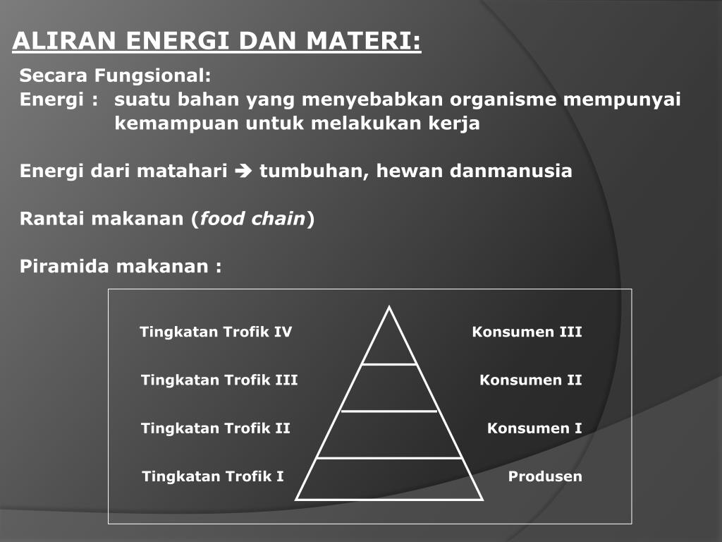 Tingkatan Trofik IV Konsumen III Tingkatan Trofik III Konsumen II Tingkatan Trofik II Konsumen I Tingkatan Trofik I Produsen ALIRAN ENERGI DAN MATERI: Secara Fungsional: Energi : suatu bahan yang menyebabkan organisme mempunyai kemampuan untuk melakukan kerja Energi dari matahari tumbuhan, hewan danmanusia Rantai makanan (food chain) Piramida makanan :