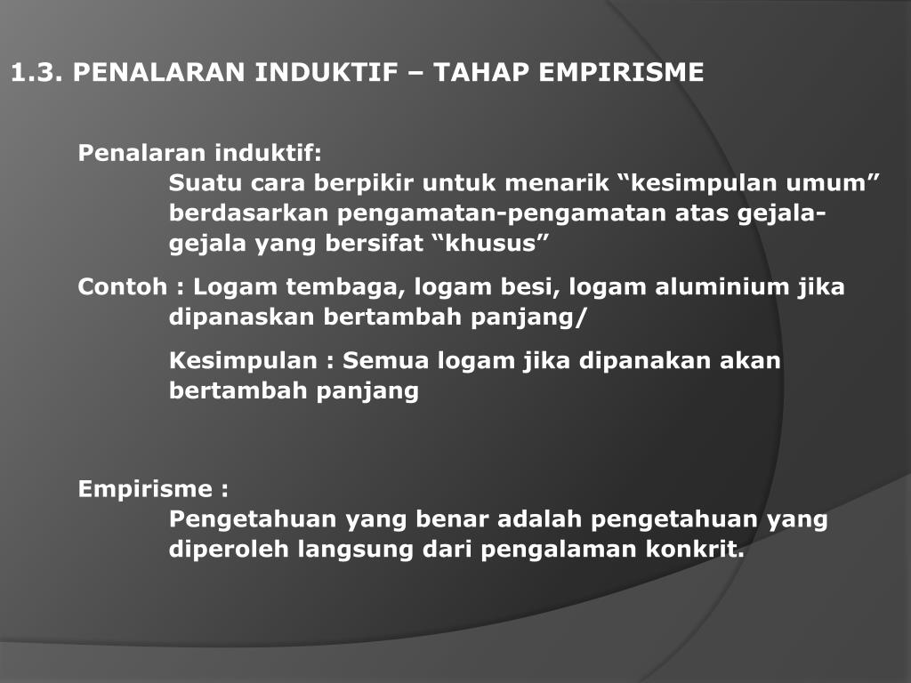 1.3. PENALARAN INDUKTIF – TAHAP EMPIRISME Penalaran induktif: Suatu cara berpikir untuk menarik “kesimpulan umum” berdasarkan pengamatan-pengamatan atas gejala-gejala yang bersifat “khusus” Contoh : Logam tembaga, logam besi, logam aluminium jika dipanaskan bertambah panjang/ Kesimpulan : Semua logam jika dipanakan akan bertambah panjang Empirisme : Pengetahuan yang benar adalah pengetahuan yang diperoleh langsung dari pengalaman konkrit.