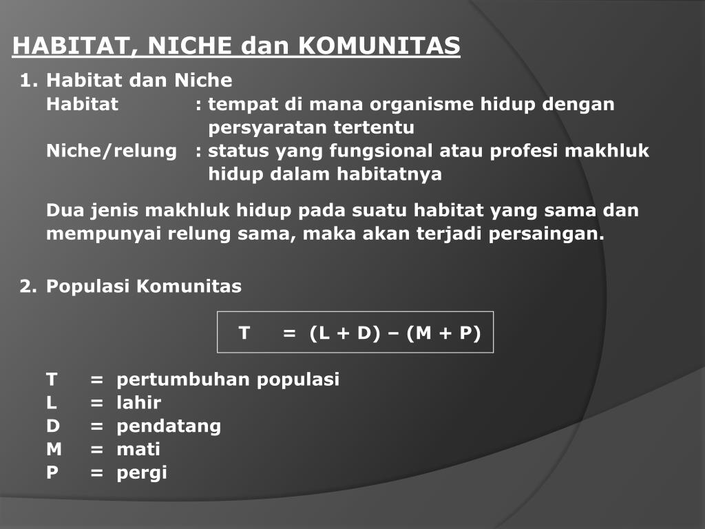 2. Populasi Komunitas T = (L + D) – (M + P) T = pertumbuhan populasi L = lahir D = pendatang M = mati P = pergi HABITAT, NICHE dan KOMUNITAS 1. Habitat dan Niche Habitat : tempat di mana organisme hidup dengan persyaratan tertentu Niche/relung : status yang fungsional atau profesi makhluk hidup dalam habitatnya Dua jenis makhluk hidup pada suatu habitat yang sama dan mempunyai relung sama, maka akan terjadi persaingan.