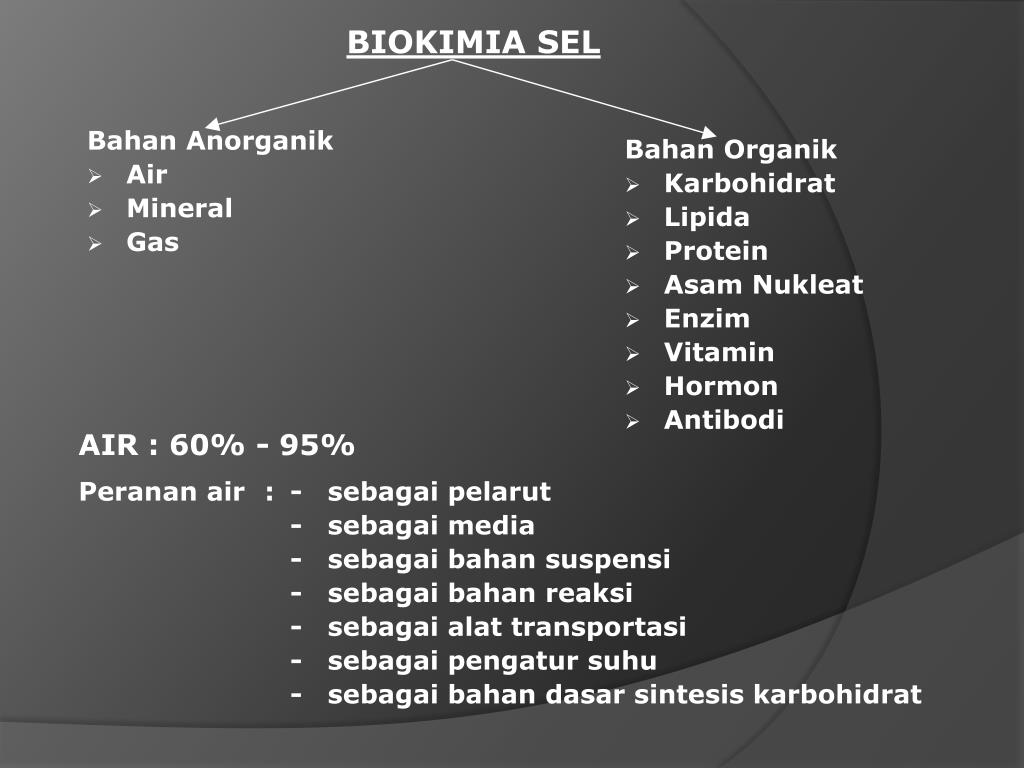 BIOKIMIA SEL Bahan Anorganik • Air • Mineral • Gas Bahan Organik • Karbohidrat • Lipida • Protein • Asam Nukleat • Enzim • Vitamin • Hormon • Antibodi AIR : 60% - 95% Peranan air : - sebagai pelarut - sebagai media - sebagai bahan suspensi - sebagai bahan reaksi - sebagai alat transportasi - sebagai pengatur suhu - sebagai bahan dasar sintesis karbohidrat
