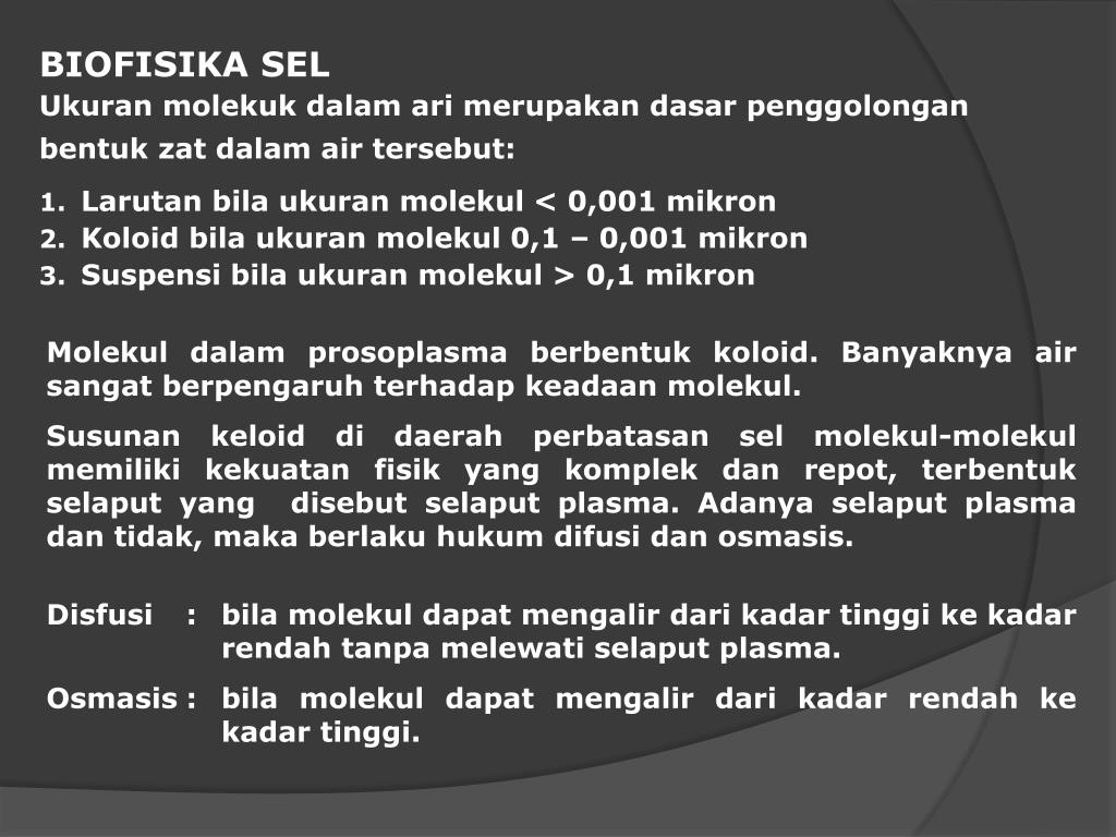 BIOFISIKA SEL Ukuran molekuk dalam ari merupakan dasar penggolongan bentuk zat dalam air tersebut: • Larutan bila ukuran molekul < 0,001 mikron • Koloid bila ukuran molekul 0,1 – 0,001 mikron • Suspensi bila ukuran molekul > 0,1 mikron Molekul dalam prosoplasma berbentuk koloid. Banyaknya air sangat berpengaruh terhadap keadaan molekul. Susunan keloid di daerah perbatasan sel molekul-molekul memiliki kekuatan fisik yang komplek dan repot, terbentuk selaput yang disebut selaput plasma. Adanya selaput plasma dan tidak, maka berlaku hukum difusi dan osmasis. Disfusi : bila molekul dapat mengalir dari kadar tinggi ke kadar rendah tanpa melewati selaput plasma. Osmasis : bila molekul dapat mengalir dari kadar rendah ke kadar tinggi.