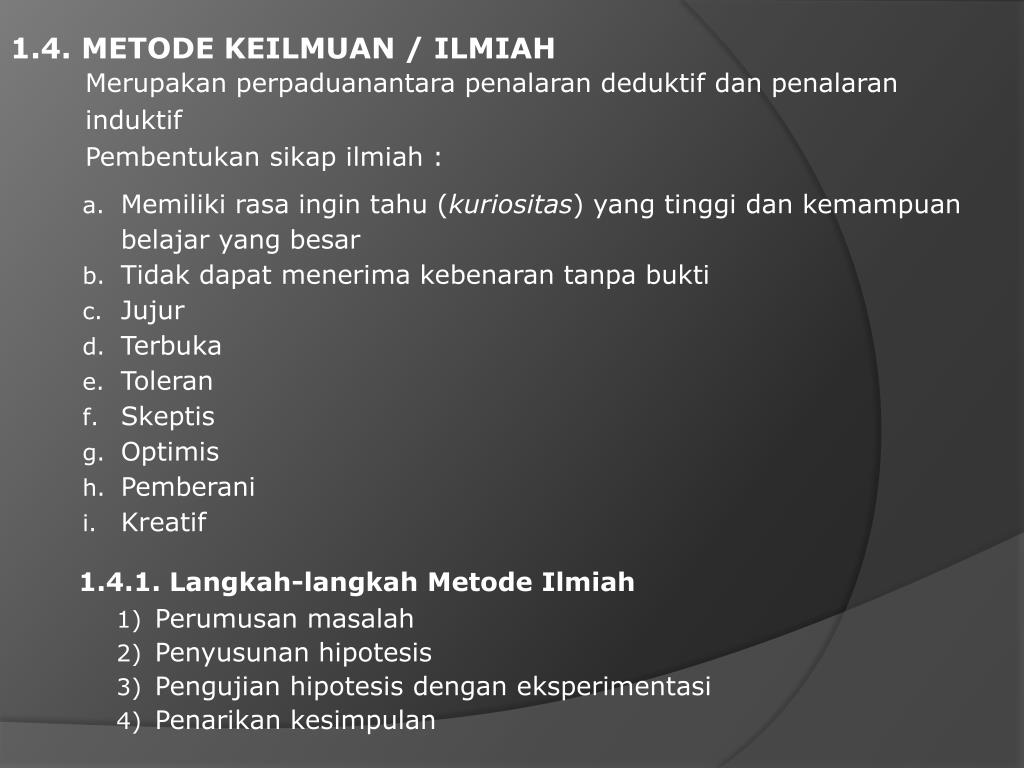 1.4. METODE KEILMUAN / ILMIAH Merupakan perpaduanantara penalaran deduktif dan penalaran induktif Pembentukan sikap ilmiah : • Memiliki rasa ingin tahu (kuriositas) yang tinggi dan kemampuan belajar yang besar • Tidak dapat menerima kebenaran tanpa bukti • Jujur • Terbuka • Toleran • Skeptis • Optimis • Pemberani • Kreatif 1.4.1. Langkah-langkah Metode Ilmiah • Perumusan masalah • Penyusunan hipotesis • Pengujian hipotesis dengan eksperimentasi • Penarikan kesimpulan