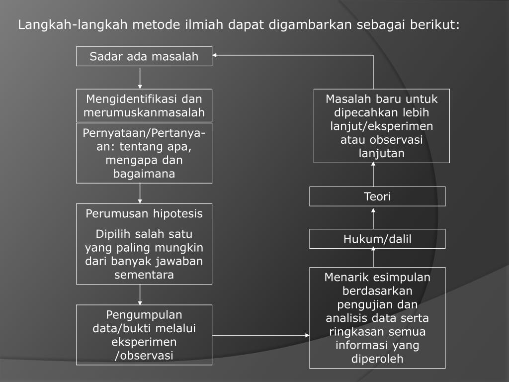 Sadar ada masalah Mengidentifikasi dan merumuskanmasalah Masalah baru untuk dipecahkan lebih lanjut/eksperimen atau observasi lanjutan Pernyataan/Pertanya-an: tentang apa, mengapa dan bagaimana Teori Perumusan hipotesis Dipilih salah satu yang paling mungkin dari banyak jawaban sementara Hukum/dalil Menarik esimpulan berdasarkan pengujian dan analisis data serta ringkasan semua informasi yang diperoleh Pengumpulan data/bukti melalui eksperimen /observasi Langkah-langkah metode ilmiah dapat digambarkan sebagai berikut: