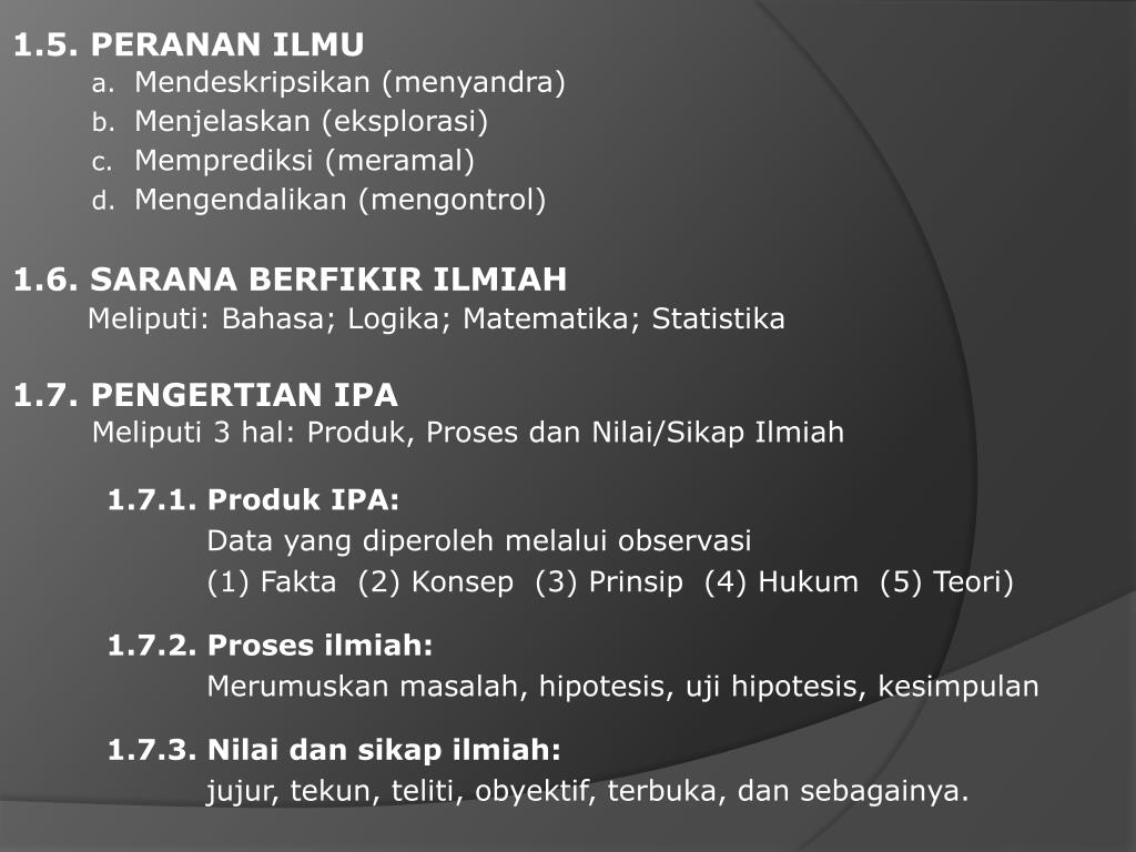 1.5. PERANAN ILMU • Mendeskripsikan (menyandra) • Menjelaskan (eksplorasi) • Memprediksi (meramal) • Mengendalikan (mengontrol) 1.6. SARANA BERFIKIR ILMIAH Meliputi: Bahasa; Logika; Matematika; Statistika 1.7. PENGERTIAN IPA Meliputi 3 hal: Produk, Proses dan Nilai/Sikap Ilmiah 1.7.1. Produk IPA: Data yang diperoleh melalui observasi (1) Fakta (2) Konsep (3) Prinsip (4) Hukum (5) Teori) 1.7.2. Proses ilmiah: Merumuskan masalah, hipotesis, uji hipotesis, kesimpulan 1.7.3. Nilai dan sikap ilmiah: jujur, tekun, teliti, obyektif, terbuka, dan sebagainya.