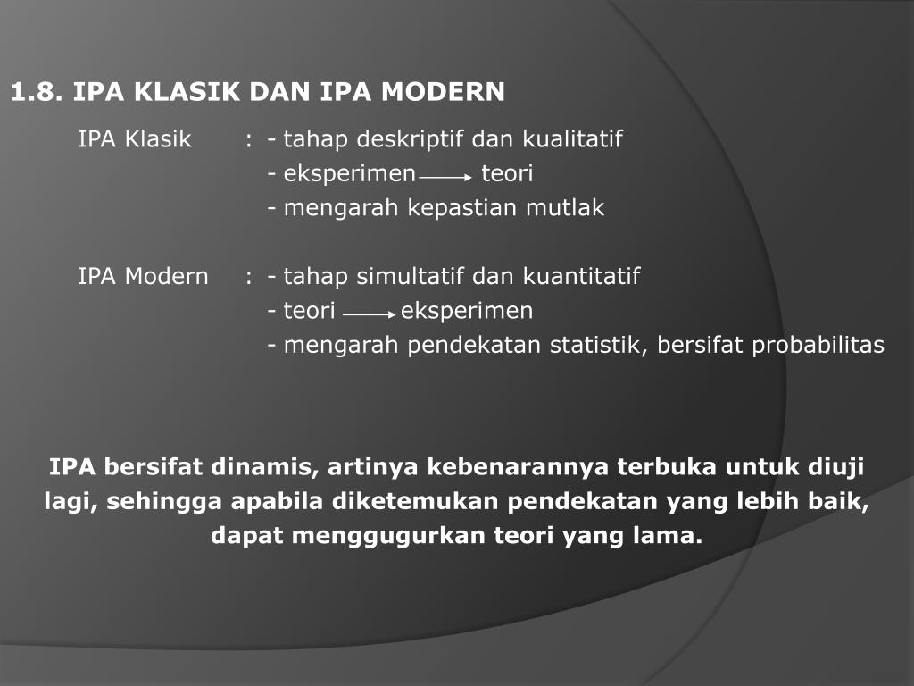 IPA Klasik : - tahap deskriptif dan kualitatif - eksperimen teori - mengarah kepastian mutlak IPA Modern : - tahap simultatif dan kuantitatif - teori eksperimen - mengarah pendekatan statistik, bersifat probabilitas 1.8. IPA KLASIK DAN IPA MODERN IPA bersifat dinamis, artinya kebenarannya terbuka untuk diuji lagi, sehingga apabila diketemukan pendekatan yang lebih baik, dapat menggugurkan teori yang lama.