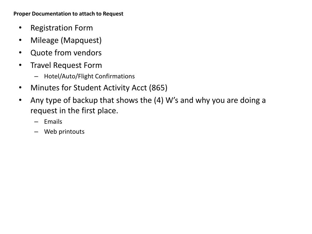 Proper Documentation to attach to Request • Registration Form • Mileage (Mapquest) • Quote from vendors • Travel Request Form • Hotel/Auto/Flight Confirmations • Minutes for Student Activity Acct (865) • Any type of backup that shows the (4) W’s and why you are doing a request in the first place. • Emails • Web printouts