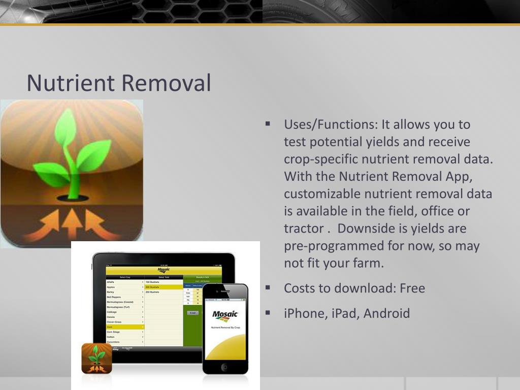 Nutrient Removal • Uses/Functions: It allows you to test potential yields and receive crop-specific nutrient removal data. With the Nutrient Removal App, customizable nutrient removal data is available in the field, office or tractor . Downside is yields are pre-programmed for now, so may not fit your farm. • Costs to download: Free • iPhone, iPad, Android