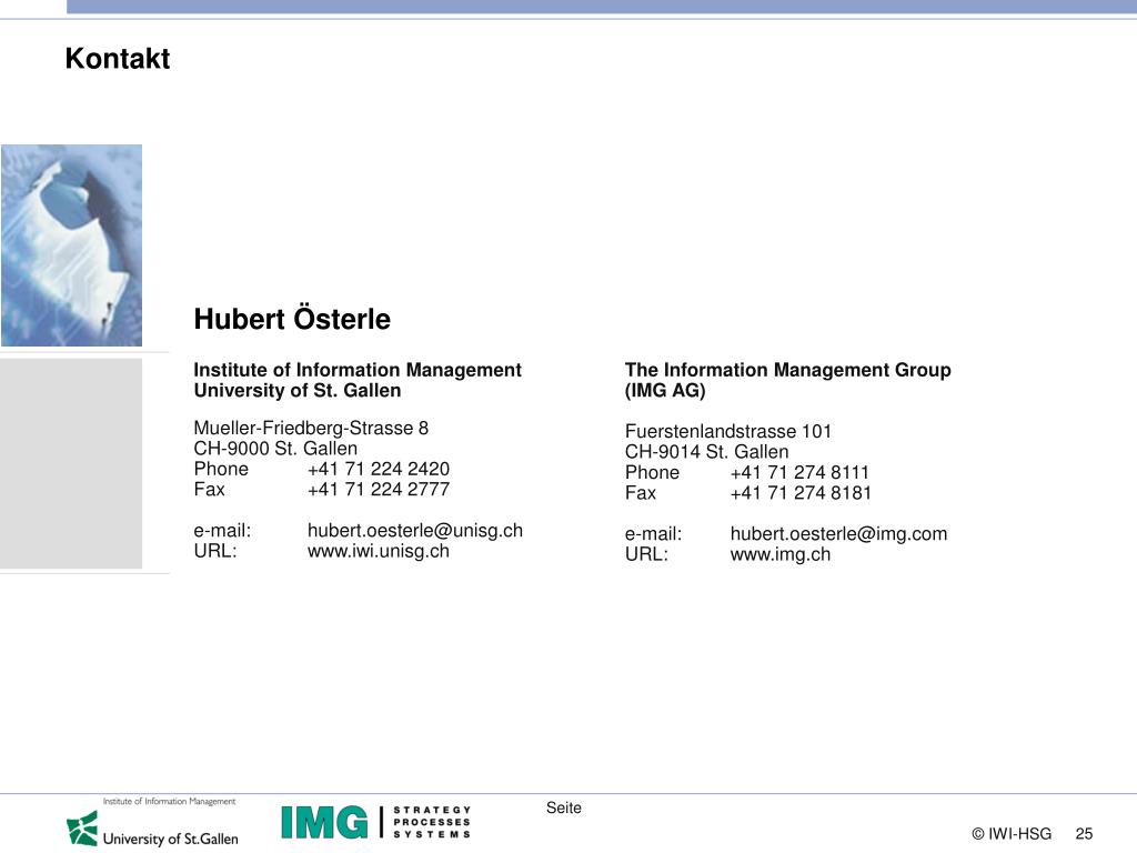 Kontakt Hubert Österle Institute of Information ManagementUniversity of St. Gallen Mueller-Friedberg-Strasse 8CH-9000 St. GallenPhone +41 71 224 2420Fax +41 71 224 2777 e-mail: hubert.oesterle@unisg.chURL: www.iwi.unisg.ch The Information Management Group (IMG AG) Fuerstenlandstrasse 101 CH-9014 St. Gallen Phone +41 71 274 8111 Fax +41 71 274 8181 e-mail: hubert.oesterle@img.com URL: www.img.ch