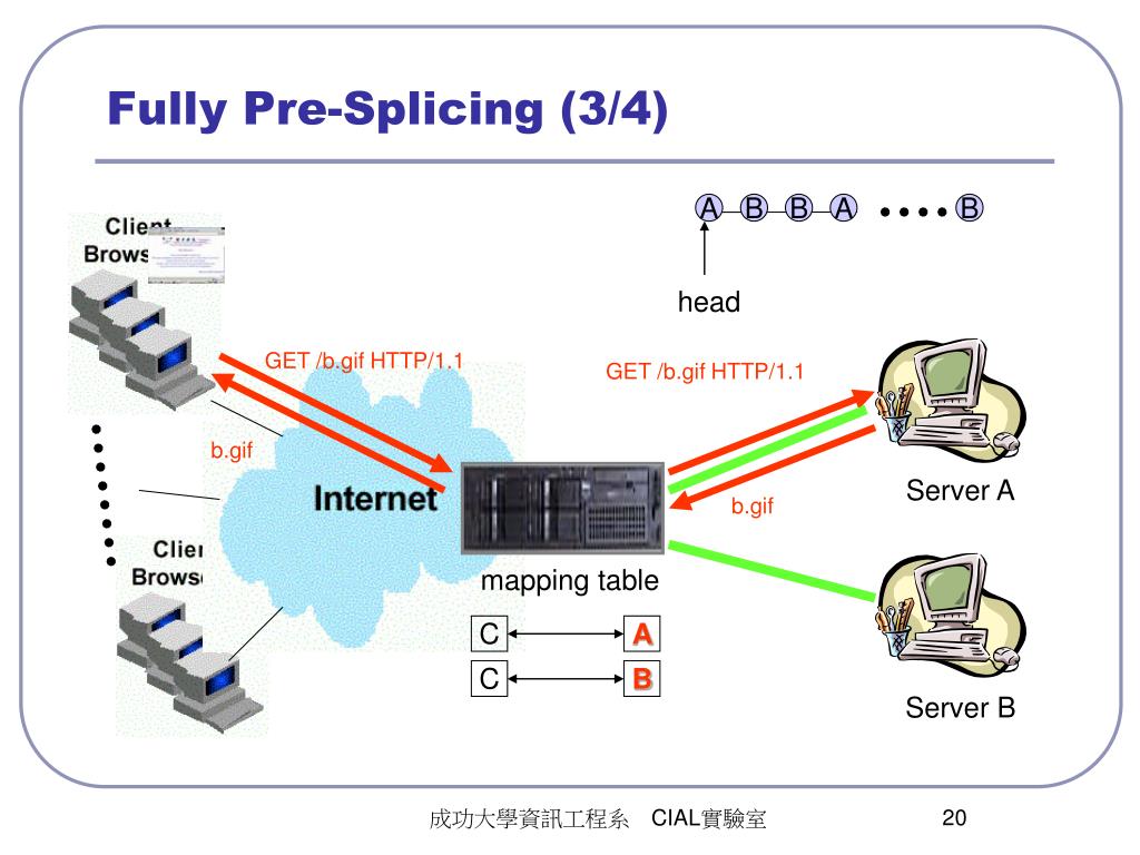 GET /b.gif HTTP/1.1 GET /b.gif HTTP/1.1 b.gif b.gif C A B B A B A C B head Fully Pre-Splicing (3/4) Server A mapping table Server B 成功大學資訊工程系 CIAL實驗室