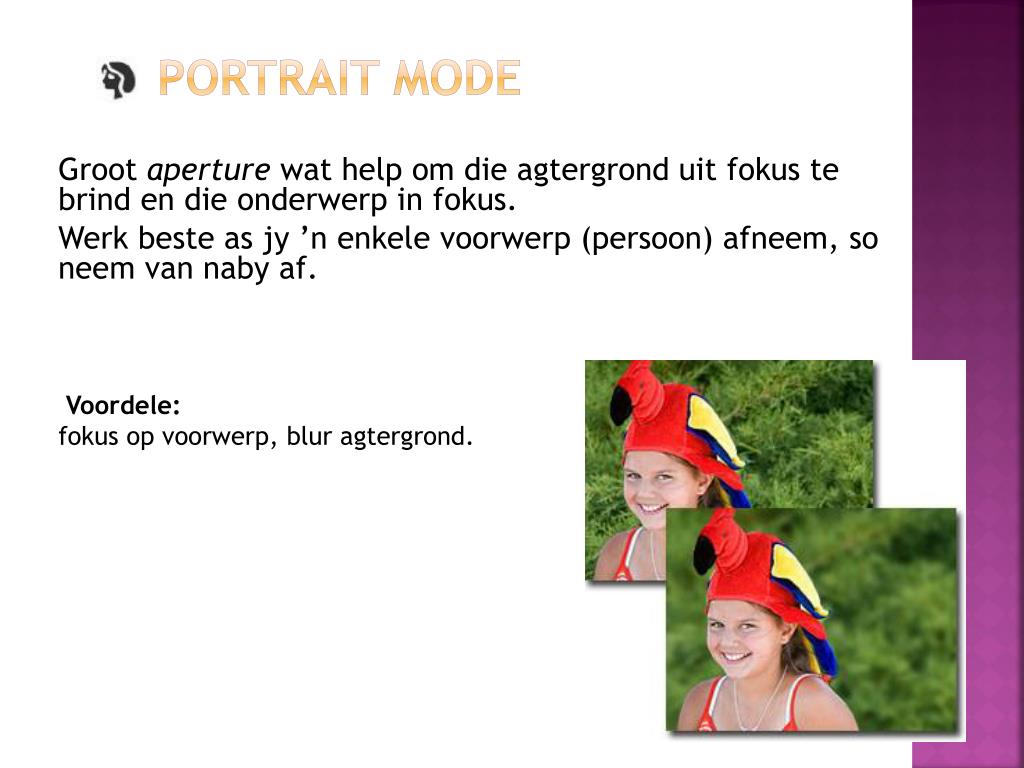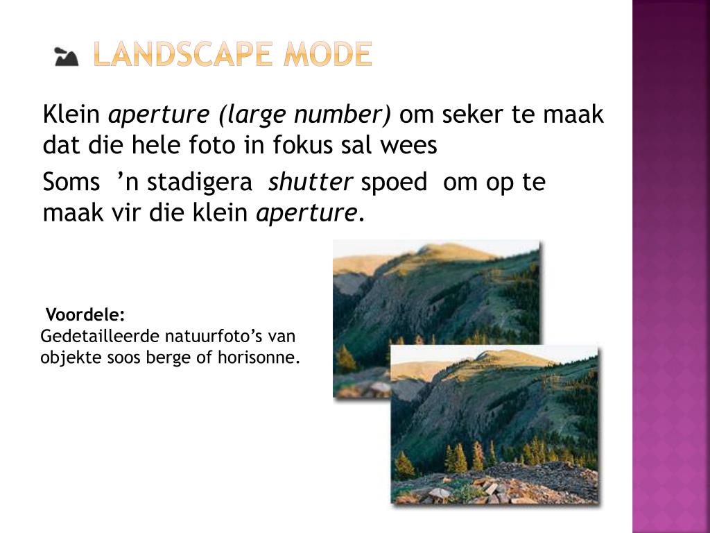 Landscape Mode Klein aperture (large number) om seker te maak dat die hele foto in fokus sal wees Soms ’n stadigera shutter spoed om op te maak vir die klein aperture. Voordele:Gedetailleerde natuurfoto’s van objekte soos berge of horisonne.