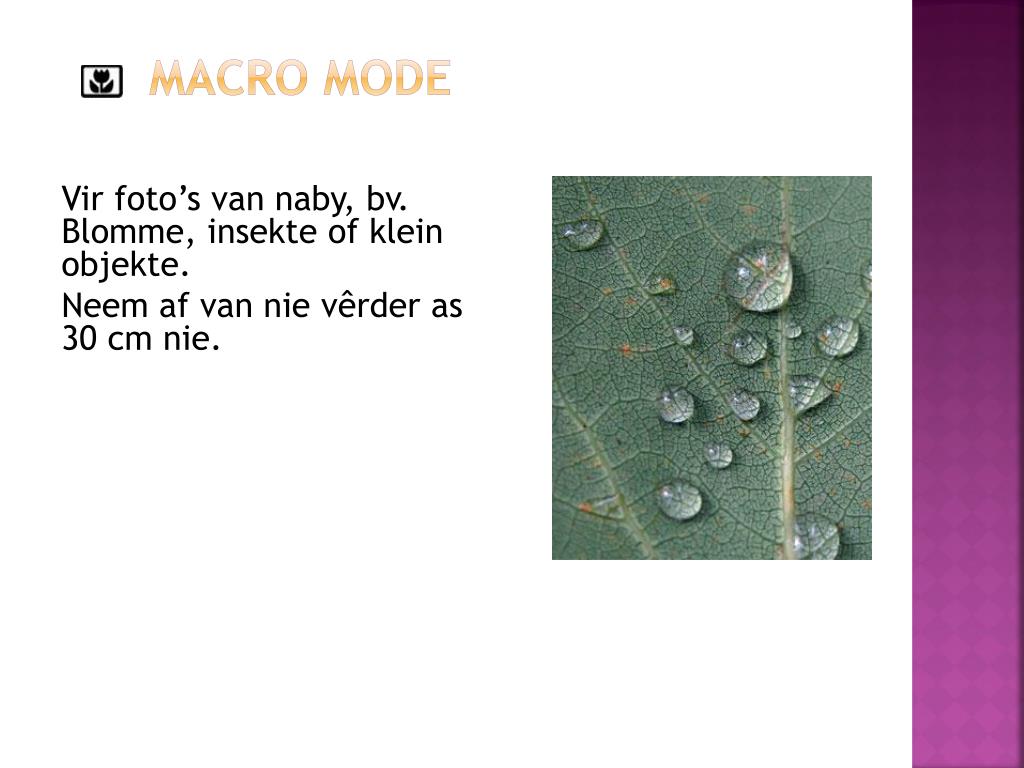 Macro Mode Vir foto’s van naby, bv. Blomme, insekte of klein objekte. Neem af van nie vêrder as 30 cm nie.