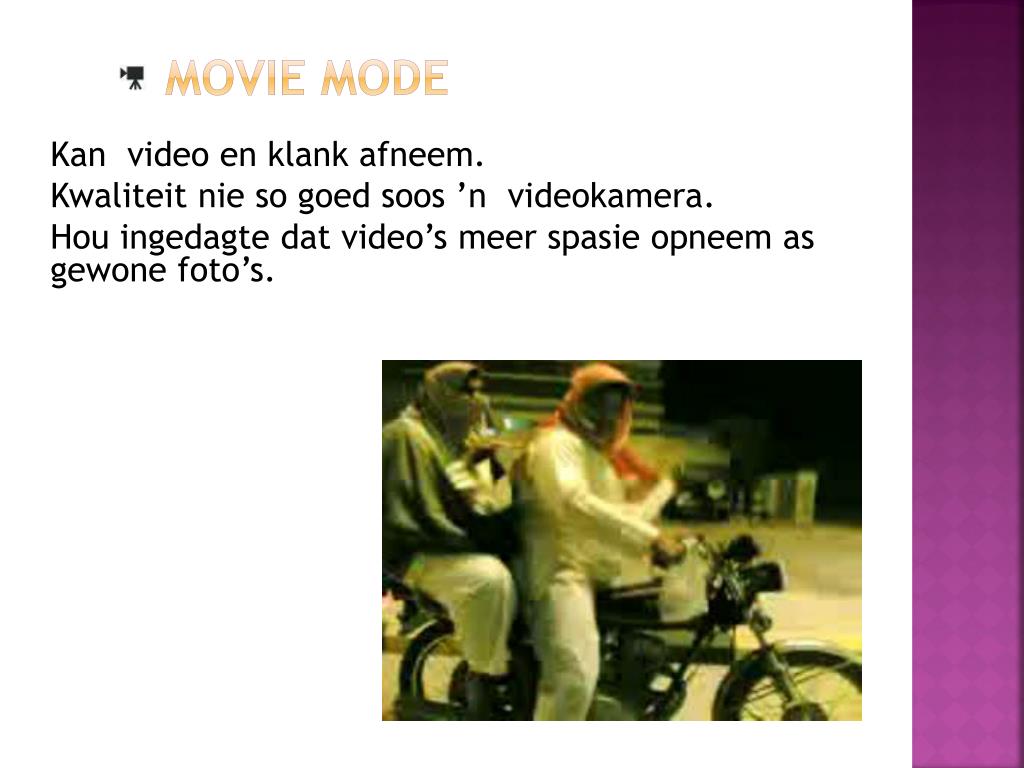 Movie Mode Kan video en klank afneem. Kwaliteit nie so goed soos ’n videokamera. Hou ingedagte dat video’s meer spasie opneem as gewone foto’s.