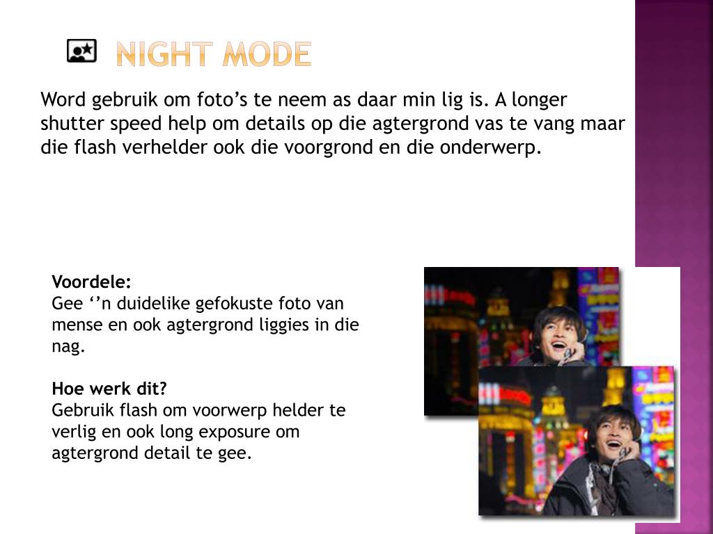 Night Mode Word gebruik om foto’s te neem as daar min lig is. A longer shutter speed help om details op die agtergrond vas te vang maar die flash verhelder ook die voorgrond en die onderwerp. Voordele:Gee ‘’n duidelike gefokuste foto van mense en ook agtergrond liggies in die nag. Hoe werk dit?Gebruik flash om voorwerp helder te verlig en ook long exposure om agtergrond detail te gee.