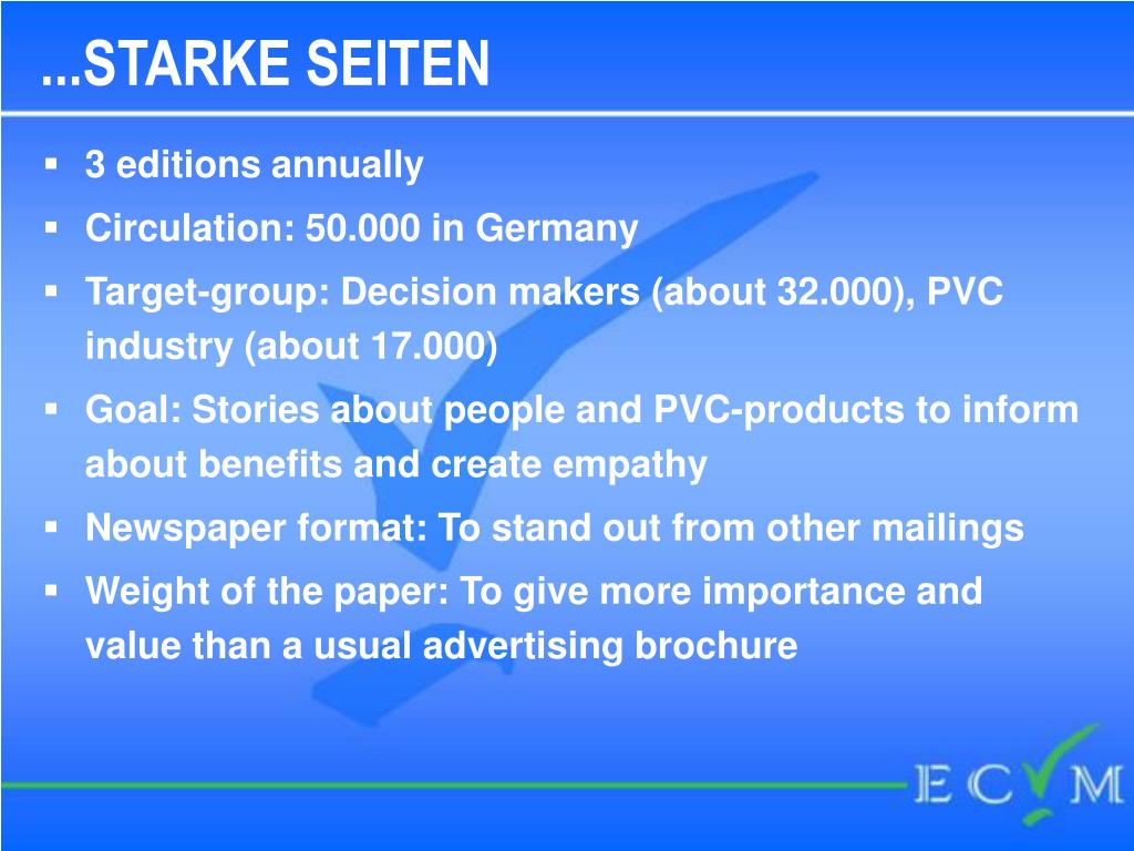 ...STARKE SEITEN • 3 editions annually • Circulation: 50.000 in Germany • Target-group: Decision makers (about 32.000), PVC industry (about 17.000) • Goal: Stories about people and PVC-products to inform about benefits and create empathy • Newspaper format: To stand out from other mailings • Weight of the paper: To give more importance and value than a usual advertising brochure