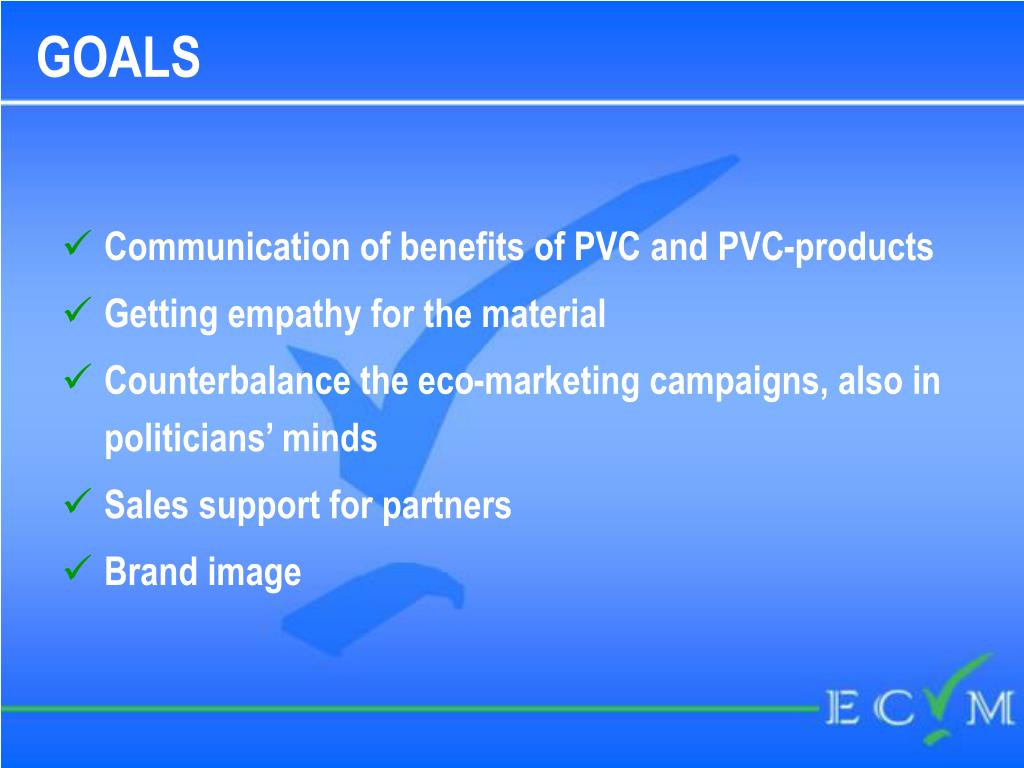 GOALS • Communication of benefits of PVC and PVC-products • Getting empathy for the material • Counterbalance the eco-marketing campaigns, also in politicians’ minds • Sales support for partners • Brand image