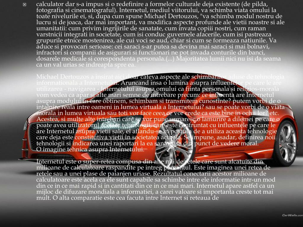 calculator dar s-a impussi o redefinire a formelorculturaledejaexistente (de pilda, fotografiasicinematograful). Internetul, mediulviitorului, vaschimbaviataomului la toatenivelurileei, si, dupa cum spune Michael Dertouzos, "vaschimbamodulnostru de lucrusi de joaca, darmai important, vamodificaaspecteprofunde ale vietiinoastresi ale umanitatii: cum privimingrijirile de sanatate, cum invatacopiiinostri, cum ramanvarstniciiintegrati in societate, cum isiconducguverneleafacerile, cum isipastreazagrupurileetnicemostenirea, ale cui voci se aud, chiarsi cum se formeazanatiunile. Vaaducesiprovocariserioase: ceisaraci s-arputeasadevinamaisaracisimaibolnavi, infractorisicompanii de asigurarisifunctionari ne pot invadaconturile din banci, dosarelemedicalesicorespondentapersonala.(...) Majoritatealumiinici nu isidaseama ca un valurias se indreaptaspre ea.Michael Dertouzos a insirataicidoarcatevaaspecte ale schimbariloraduse de tehnologiainformationala a Internetului. Aruncandinsa o luminaasuprainfluentelorpe care le are utilizarea - navigarea - Internetuluiasupraomului ca fiintapersonalasireligios-moralavomvedea ca aparsialtemarisemne de intrebareprecum: ceinfluenta are Internetulasupramodului in care obtinem, schimbamsitransmitemcunostinte? putemvorbi de o intalnirerealaintreoameni in lumeavirtuala a Internetului? sau se poatevorbi de o viatamorala in lumeavirtualasautotivor face ceeacevorcrede ca estebine in ochiilor? etc. Acestea, simultealteintrebari care se vorpuneurmaresc o lamurire a dilemeipe care o poateaveautilizatorulacestortehnologii, care esteconfruntat cu influentelepe care le are Internetulasupravietii sale, el aflandu-se in postura de a utilizaaceastatehnologie care dejaesteconstitutivavietii in societateaactuala. Se impune, asadar, definireanoiitehnologiisiindicareauneiraportari la ea sanatoasa din punct de vedere moral.O imagine tehnicaasupraInternetului.Internetuleste o super-reteacompusa din altemii de retele care suntalcatuite din milioane de calculatoareraspanditepeintregpamantul. Este imagineauneiretea de retelesau a uneiplase de paianjenuriase. Rezultatulconectariiacestormilioane de calculatoareesteacela ca elesuntcapabilesaschimbeintreeleinformatieintr-un mod din ce in cemai rapid si in cantitati din ce in cemaimari. Internetulapareastfel ca un mijloc de difuzaremondiala a informatiei, a careivaloaresiimportantacreste tot maimult. O altacomparatieesteceafacutaintre Internet sireteaua de