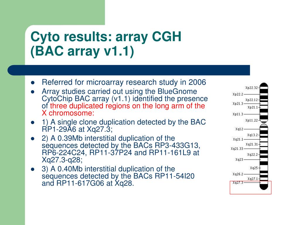 Cyto results: array CGH (BAC array v1.1) • Referred for microarray research study in 2006 • Array studies carried out using the BlueGnome CytoChip BAC array (v1.1) identified the presence of three duplicated regions on the long arm of the X chromosome: • 1) A single clone duplication detected by the BAC RP1-29A6 at Xq27.3; • 2) A 0.39Mb interstitial duplication of the sequences detected by the BACs RP3-433G13, RP6-224C24, RP11-37P24 and RP11-161L9 at Xq27.3-q28; • 3) A 0.40Mb interstitial duplication of the sequences detected by the BACs RP11-54I20 and RP11-617G06 at Xq28.