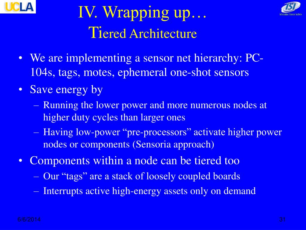IV. Wrapping up…Tiered Architecture • We are implementing a sensor net hierarchy: PC-104s, tags, motes, ephemeral one-shot sensors • Save energy by • Running the lower power and more numerous nodes at higher duty cycles than larger ones • Having low-power “pre-processors” activate higher power nodes or components (Sensoria approach) • Components within a node can be tiered too • Our “tags” are a stack of loosely coupled boards • Interrupts active high-energy assets only on demand