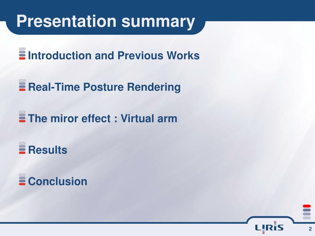 Presentation summary • Introduction and Previous Works • Real-Time Posture Rendering • The miror effect : Virtual arm • Results • Conclusion