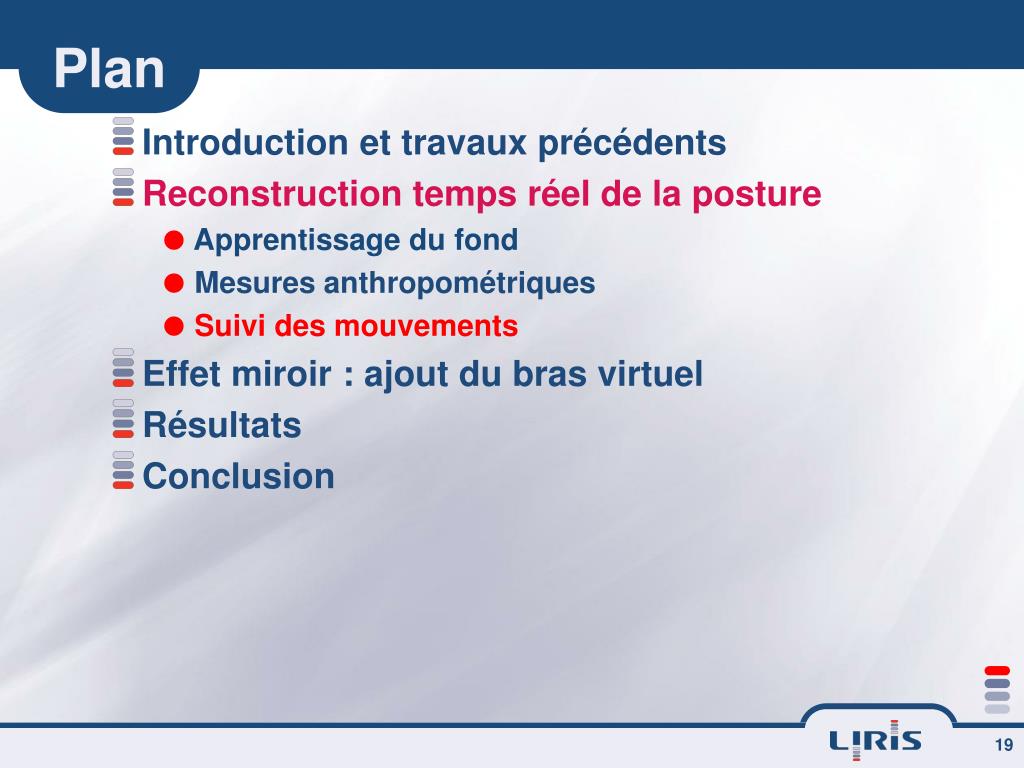 Plan • Introduction et travaux précédents • Reconstruction temps réel de la posture • Apprentissage du fond • Mesures anthropométriques • Suivi des mouvements • Effet miroir : ajout du bras virtuel • Résultats • Conclusion
