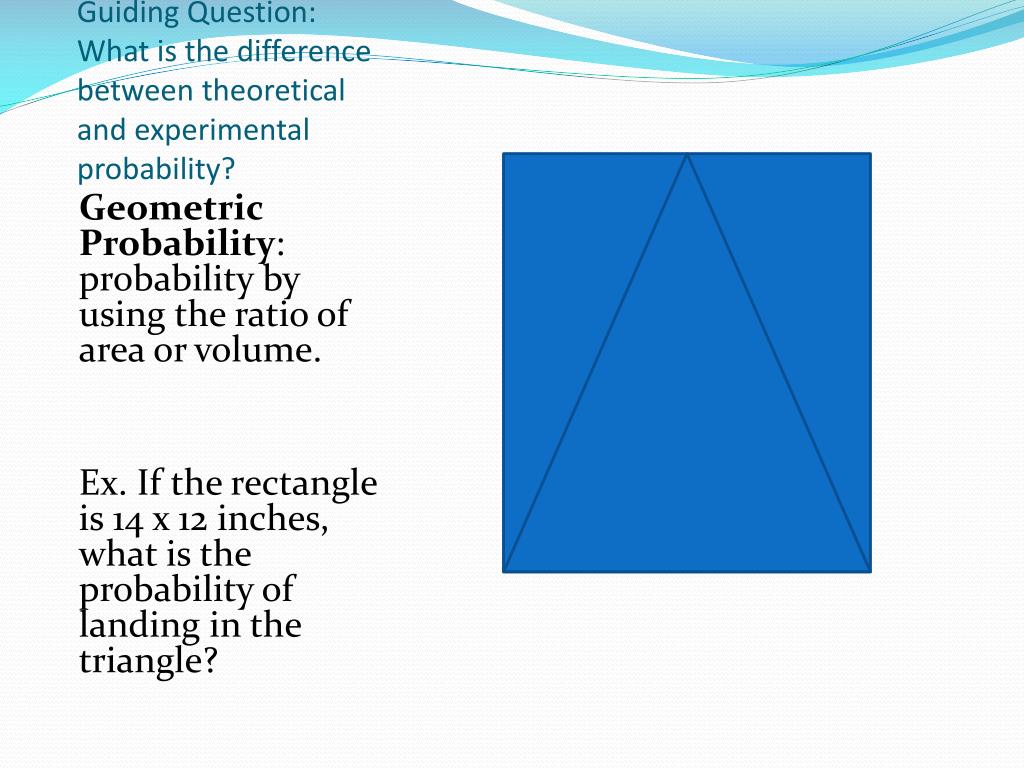 Guiding Question: What is the difference between theoretical and experimental probability? Geometric Probability: probability by using the ratio of area or volume. Ex. If the rectangle is 14 x 12 inches, what is the probability of landing in the triangle?