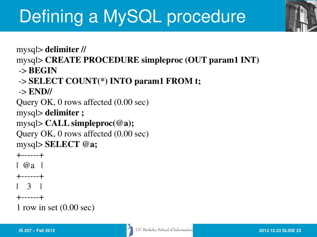 Defining a MySQL procedure mysql> delimiter // mysql> CREATE PROCEDURE simpleproc (OUT param1 INT) -> BEGIN -> SELECT COUNT(*) INTO param1 FROM t; -> END// Query OK, 0 rows affected (0.00 sec) mysql> delimiter ; mysql> CALL simpleproc(@a); Query OK, 0 rows affected (0.00 sec) mysql> SELECT @a; +------+ | @a | +------+ | 3 | +------+ 1 row in set (0.00 sec)
