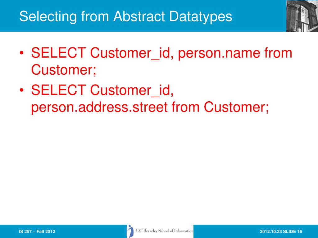 Selecting from Abstract Datatypes • SELECT Customer_id, person.name from Customer; • SELECT Customer_id, person.address.street from Customer;