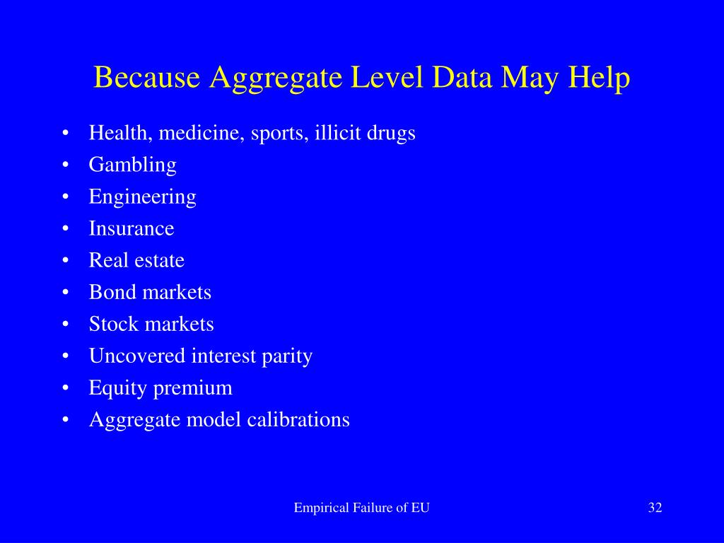Because Aggregate Level Data May Help • Health, medicine, sports, illicit drugs • Gambling • Engineering • Insurance • Real estate • Bond markets • Stock markets • Uncovered interest parity • Equity premium • Aggregate model calibrations Empirical Failure of EU
