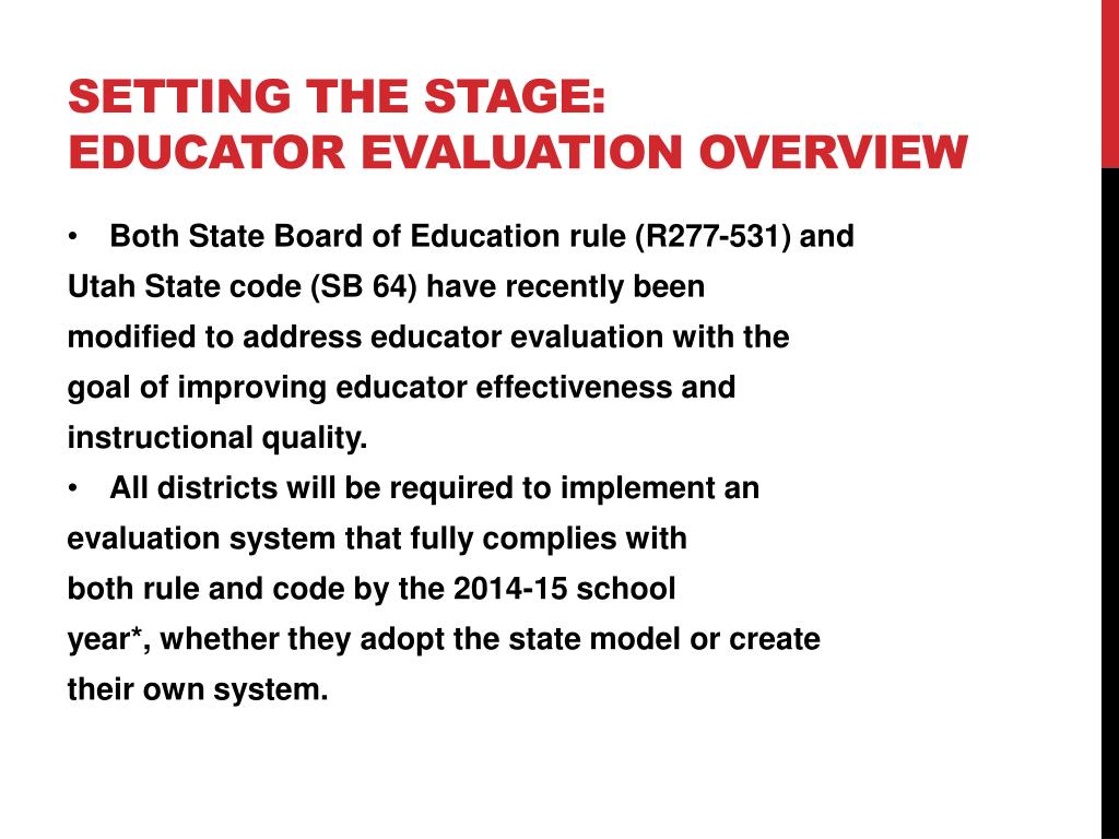 Setting the stage:educator evaluation overview • Both State Board of Education rule (R277-531) and • Utah State code (SB 64) have recently been • modified to address educator evaluation with the • goal of improving educator effectiveness and • instructional quality. • All districts will be required to implement an • evaluation system that fully complies with • both rule and code by the 2014-15 school • year*, whether they adopt the state model or create • their own system.