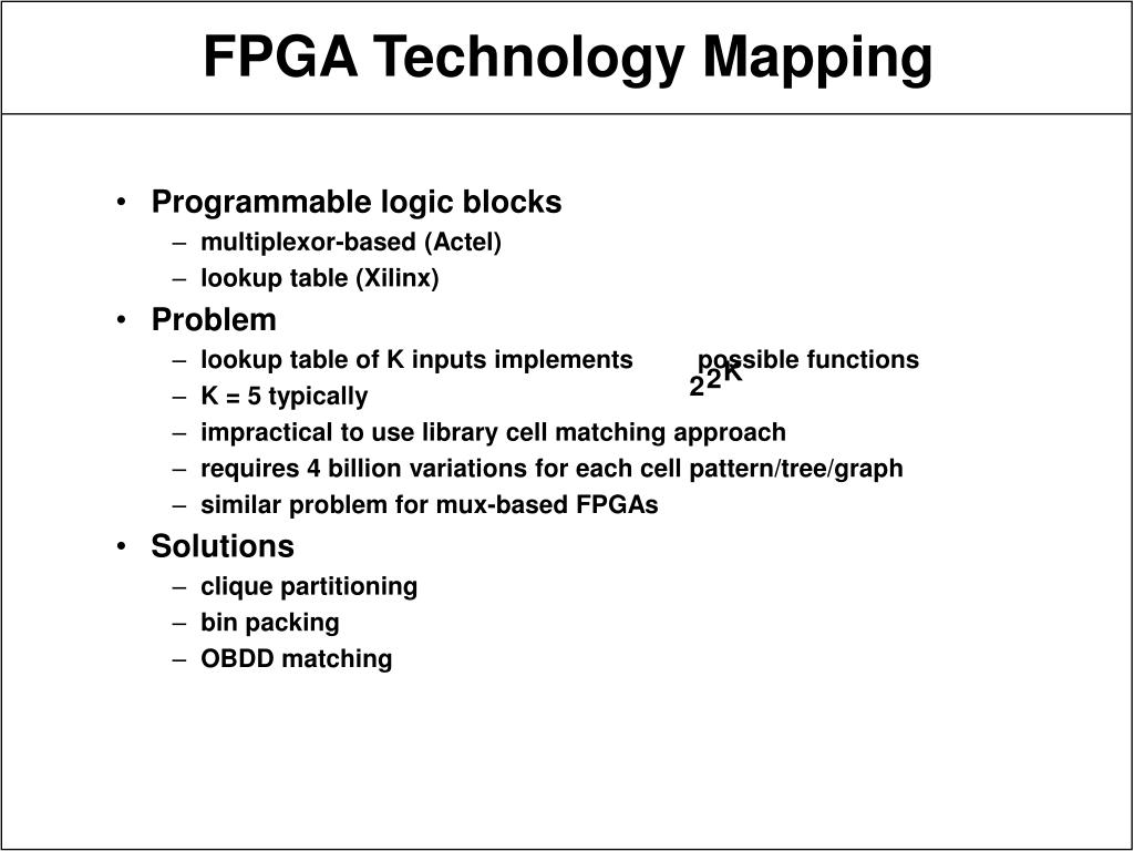 Programmable logic blocks multiplexor-based (Actel) lookup table (Xilinx) Problem lookup table of K inputs implements possible functions K = 5 typically impractical to use library cell matching approach requires 4 billion variations for each cell pattern/tree/graph similar problem for mux-based FPGAs Solutions clique partitioning bin packing OBDD matching FPGA Technology Mapping