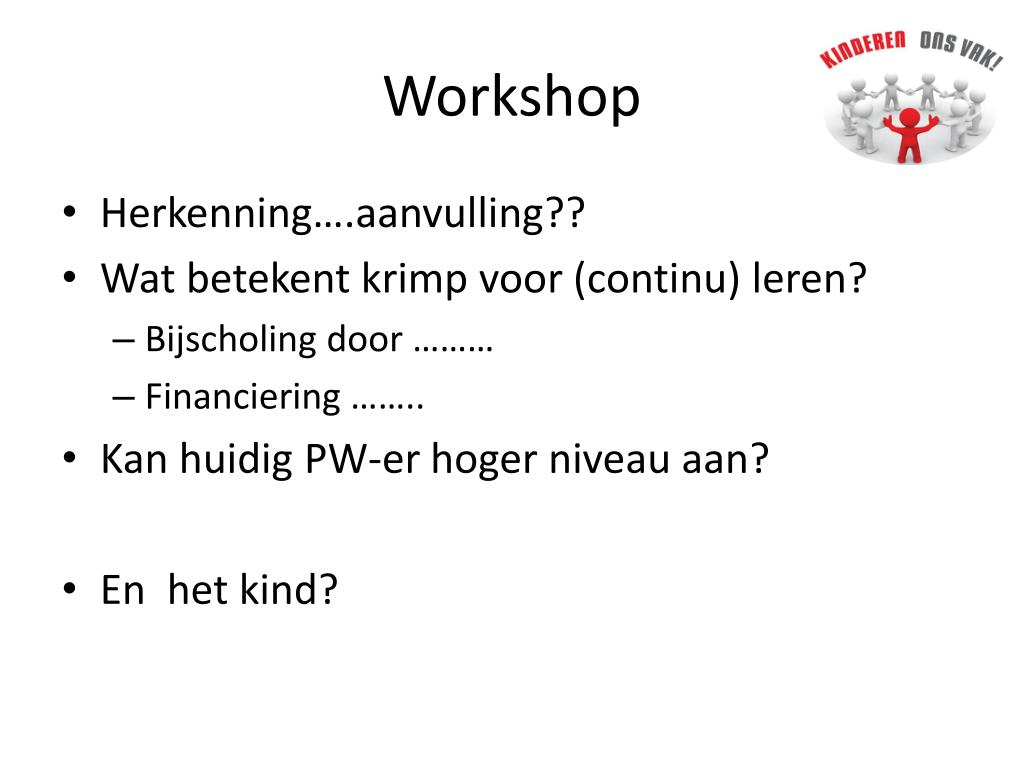 Workshop • Herkenning….aanvulling?? • Wat betekent krimp voor (continu) leren? • Bijscholing door ……… • Financiering …….. • Kan huidig PW-er hoger niveau aan? • En het kind?