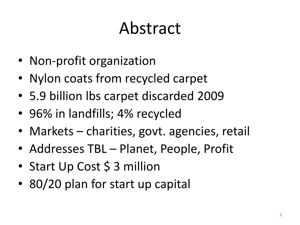 Abstract • Non-profit organization • Nylon coats from recycled carpet • 5.9 billion lbs carpet discarded 2009 • 96% in landfills; 4% recycled • Markets – charities, govt. agencies, retail • Addresses TBL – Planet, People, Profit • Start Up Cost $ 3 million • 80/20 plan for start up capital